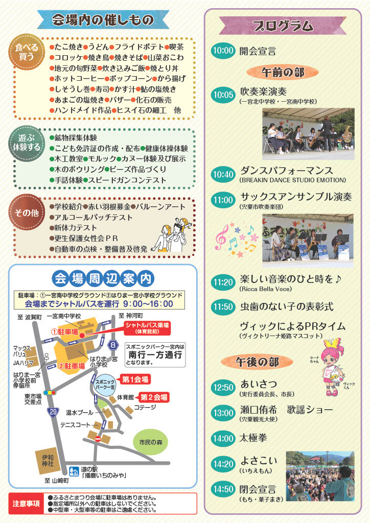 会場近くの一宮南中学校とはりま一宮小学校のグラウンドをご利用ください。会場までのシャトルバスを運行します。 ※普通車以外の駐車場はありません。 |